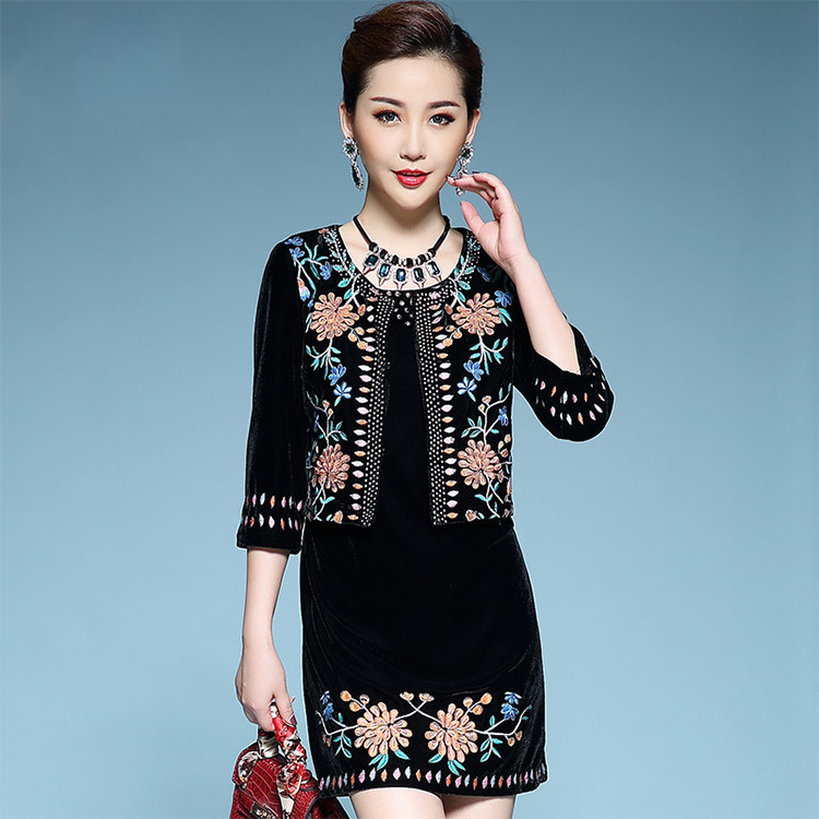 2015秋款中老年女裝民族風刺繡高端金絲絨時尚連衣裙套裝2件套 /