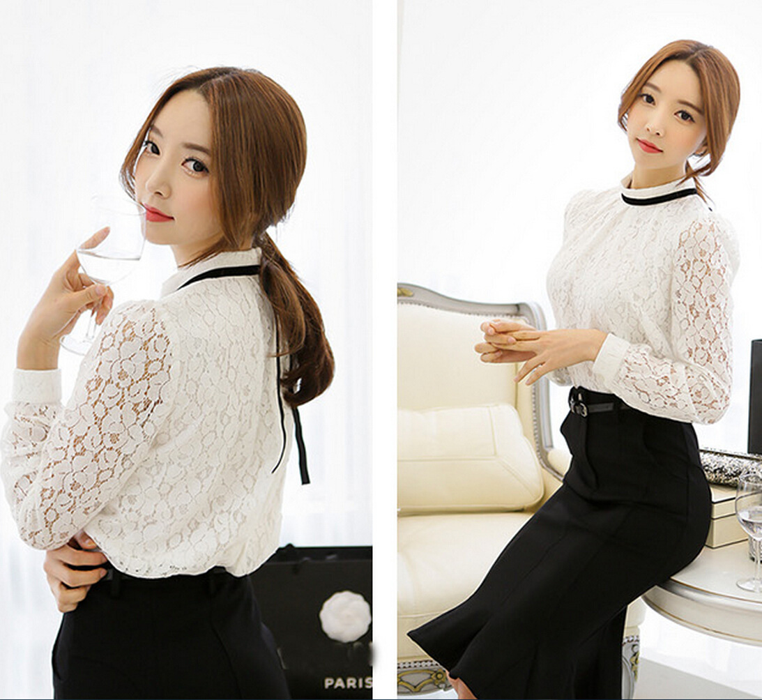 2015秋冬新款韓版 時尚立領荷葉邊長袖蕾絲衫+魚尾裙套裝 /