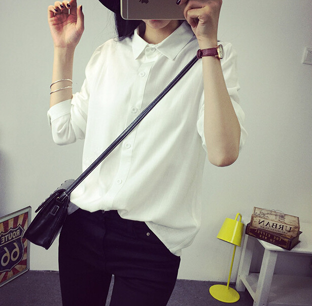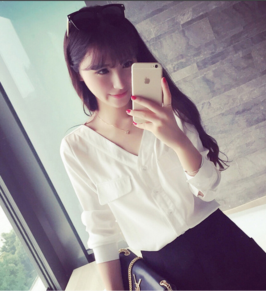 秋裝新款2015韓版前后V領假口袋百搭雪紡襯衣襯衫女 /