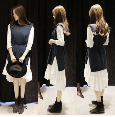 2015秋冬長袖寬松純棉連衣裙背心無袖前短后長毛衣套裝送腰帶 /