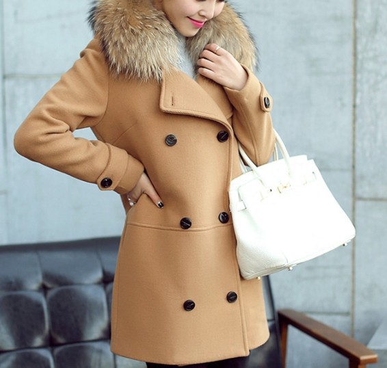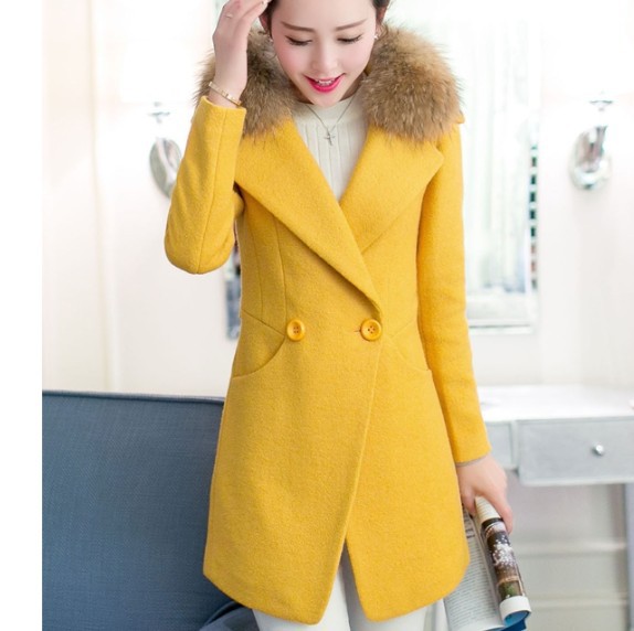 2015秋冬裝女裝 韓版修身毛領(lǐng)毛呢外套加厚呢子大衣女中長款 批發(fā) /