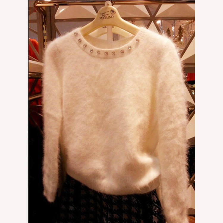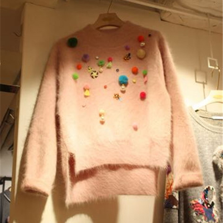 韓國代購2015秋新款針織衫韓版女裝長袖寬松加厚圓領釘珠馬海毛衣 /