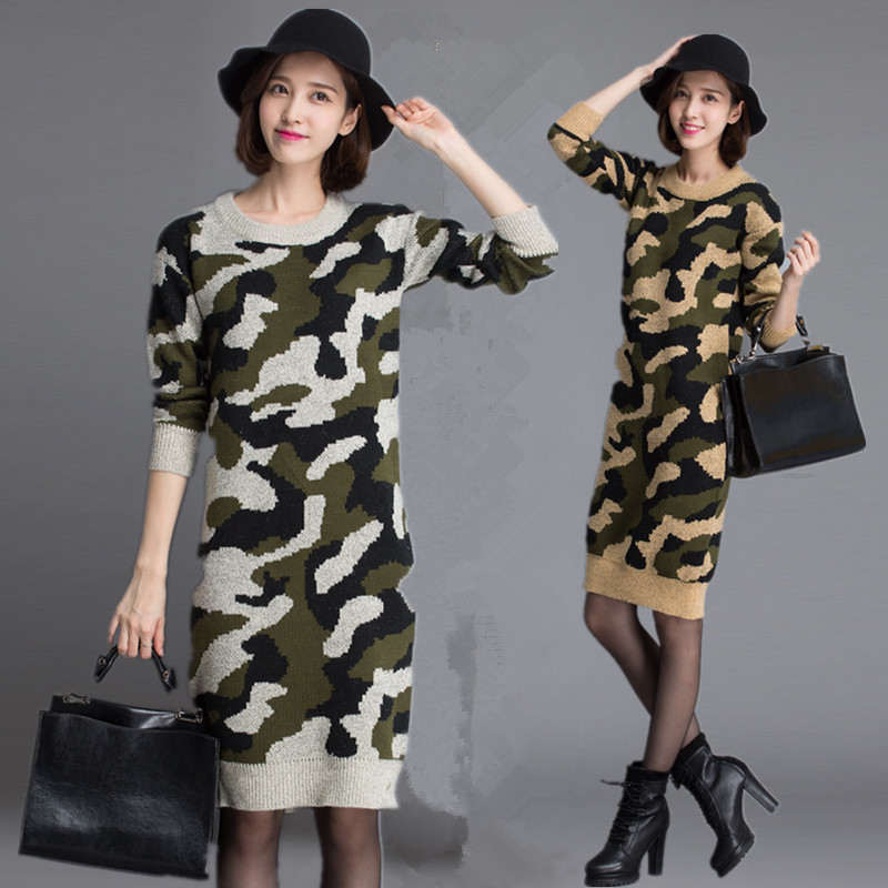 韓國毛衣女士秋冬新款韓版迷彩長袖圓領套頭針織打底長款毛衣裙女 /
