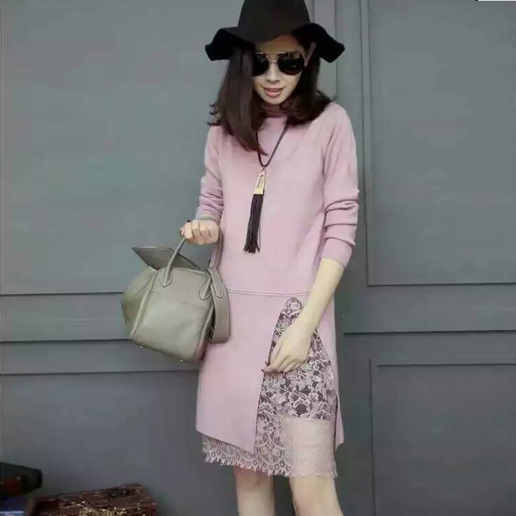 廠家直銷2015年秋冬新品寬松毛衣女蕾絲中長款純色圓領開叉連衣裙 /