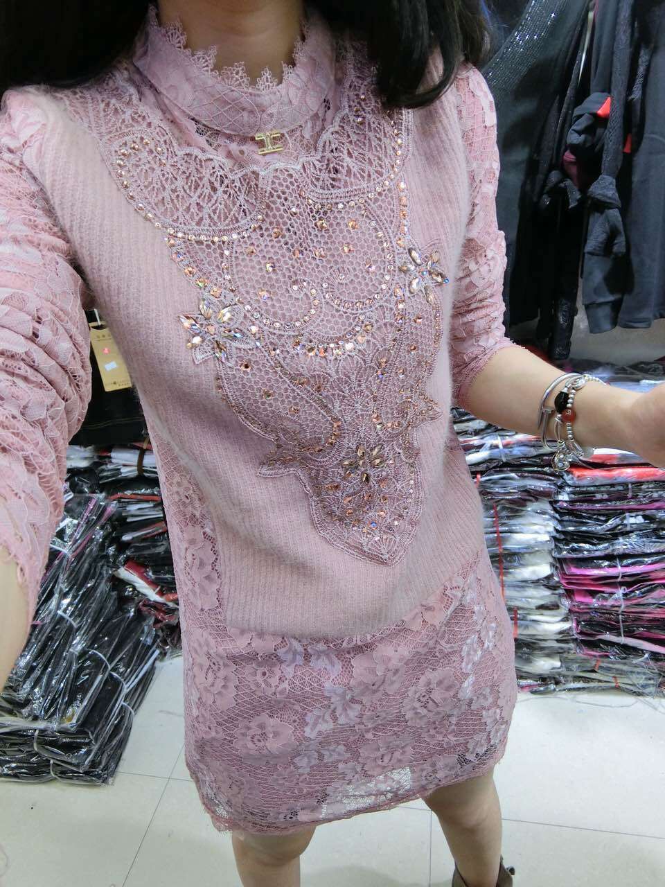 新品2015秋冬中長款韓版修身長袖蕾絲衫加絨加厚蕾絲打底衫女潮 /