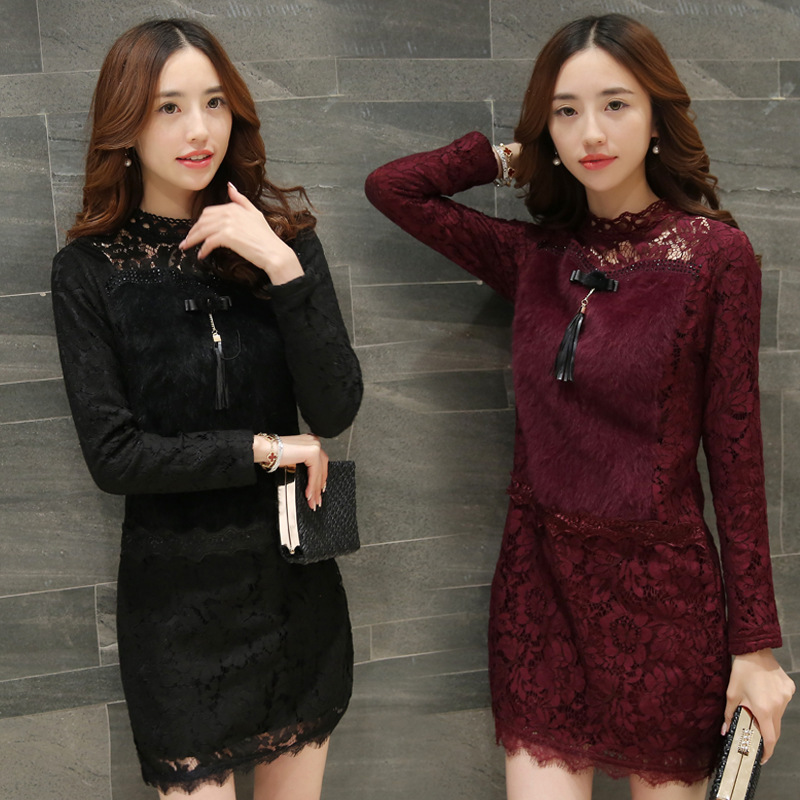 2015秋冬新款女修身蕾絲小衫加絨加厚中長款蕾絲打底衫招代理 /