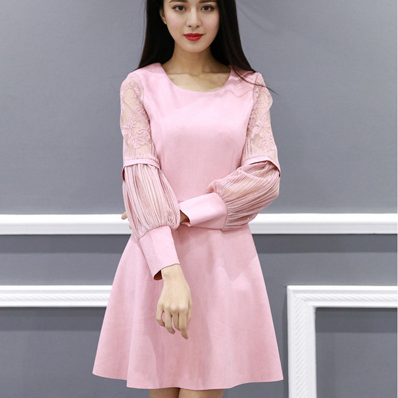 實拍2016春新款修身中長款網紗拼接鹿皮絨長袖A字連衣裙 /