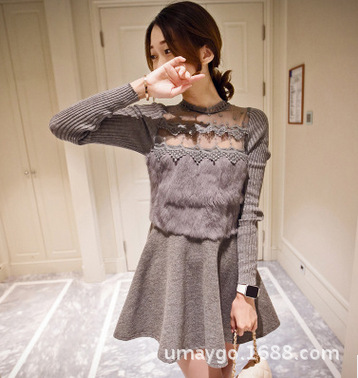 韓國東大門2015冬季新款女裝圓領蕾絲兔毛拼接打底修身針織連衣裙 /