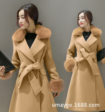 2015新款韓版女裝冬毛領修身長款毛呢外套女系帶收腰西裝領呢大衣 /