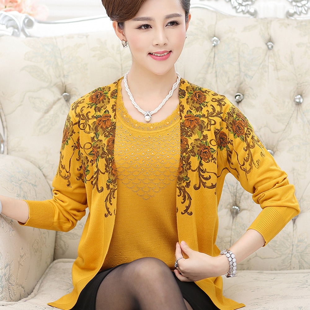 時尚印花兩件套媽媽裝 秋季羊毛針織衫 開衫毛衣 中老年精品女裝 /