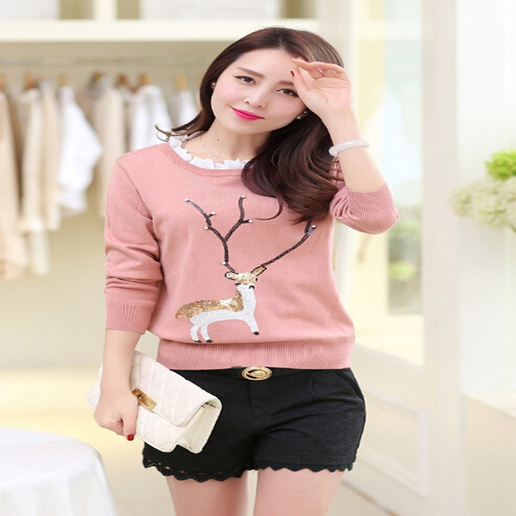 廠家直銷毛衣女 套頭花邊領(lǐng)圓領(lǐng)針織打底短款長袖羊毛衫小鹿釘珠 /
