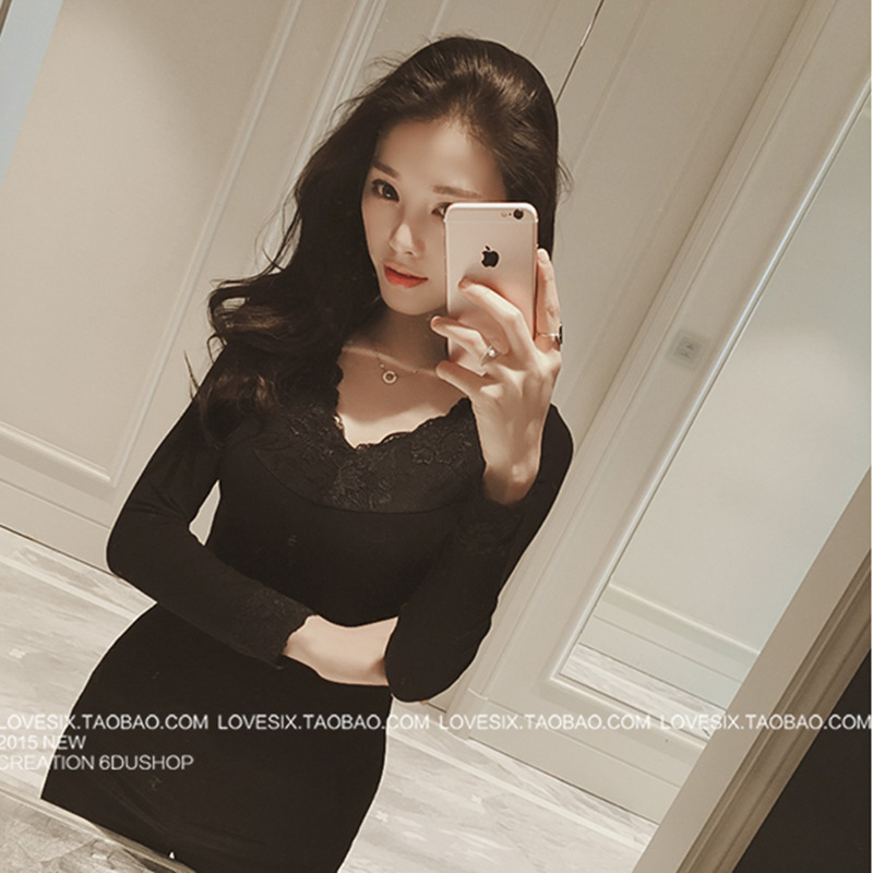 6度歐美2015冬裝保暖加絨打底蕾絲修身短保暖內衣上衣女潮 /