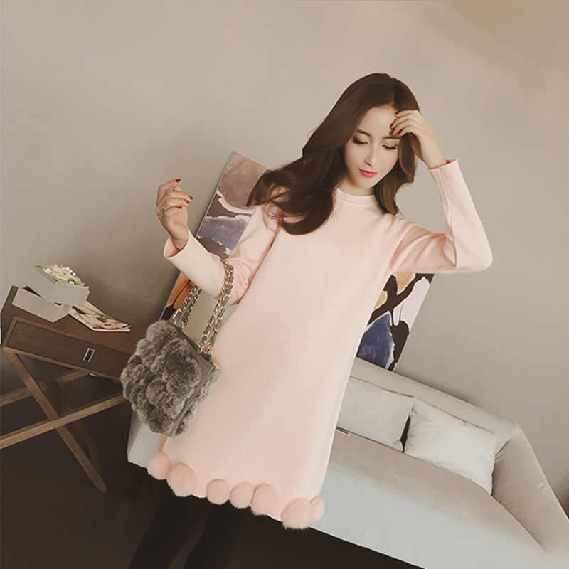 2015冬季女裝新款韓版下擺毛球中長款加厚針織連衣裙打底衫 /