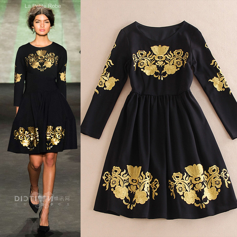 歐美2015秋新款女裝氣質百搭收腰修身針織重工刺繡連衣裙 /