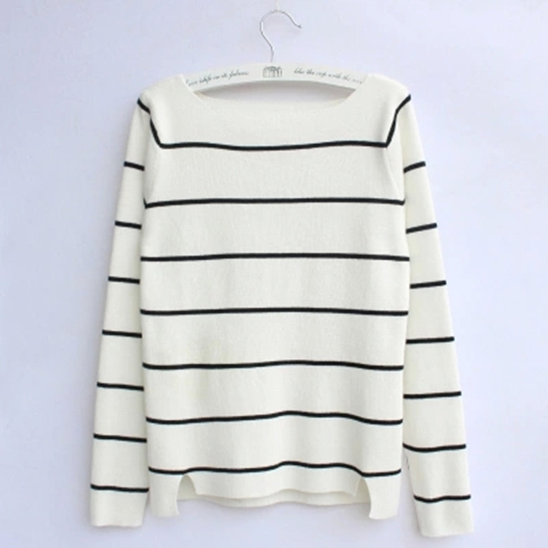 秋冬新款長袖打底毛衣女一字領(lǐng)套頭修身外套薄款條紋針織衫批發(fā)款 /