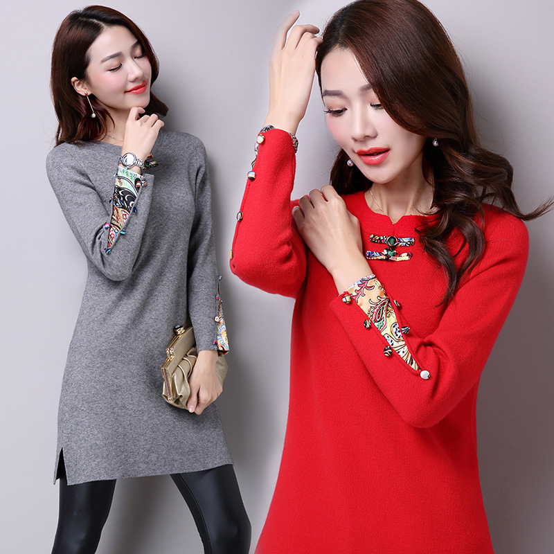 歐洲站新款毛衣連衣裙長款羊絨衫女套頭時(shí)尚釘珠打底開叉裙批發(fā) /