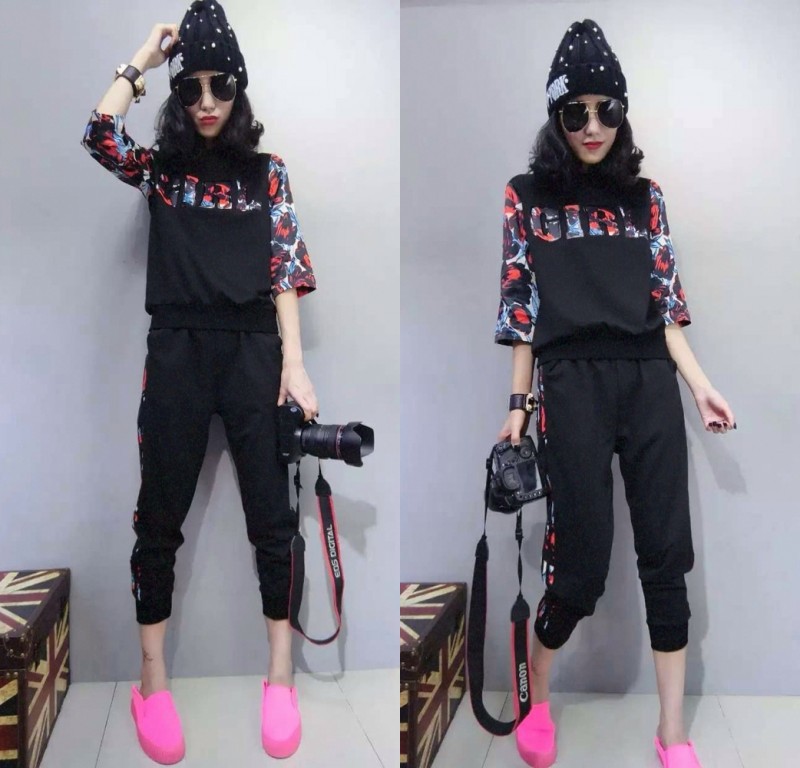 2015韓版秋休閑印花圖案運動套裝女時尚哈倫褲兩件套 /