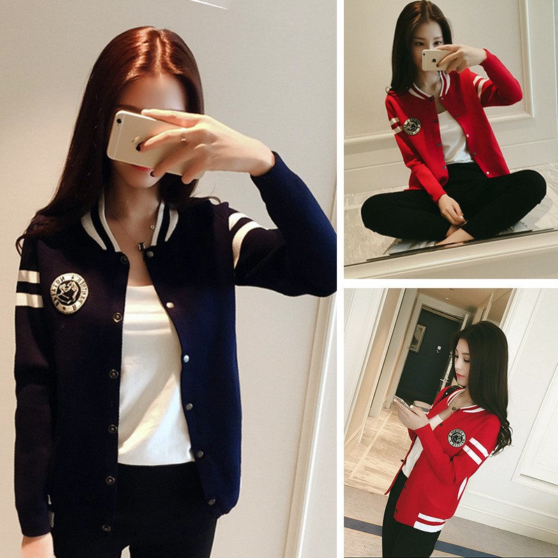2015秋季新款 韓版時尚條紋單排扣棒球服短款針織衫外套女 /