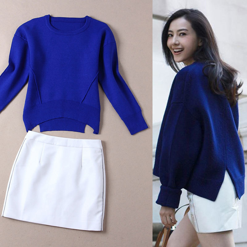 2015秋冬新款高圓圓同款休閑寬松針織毛衣+皮裙半身裙套裝 /
