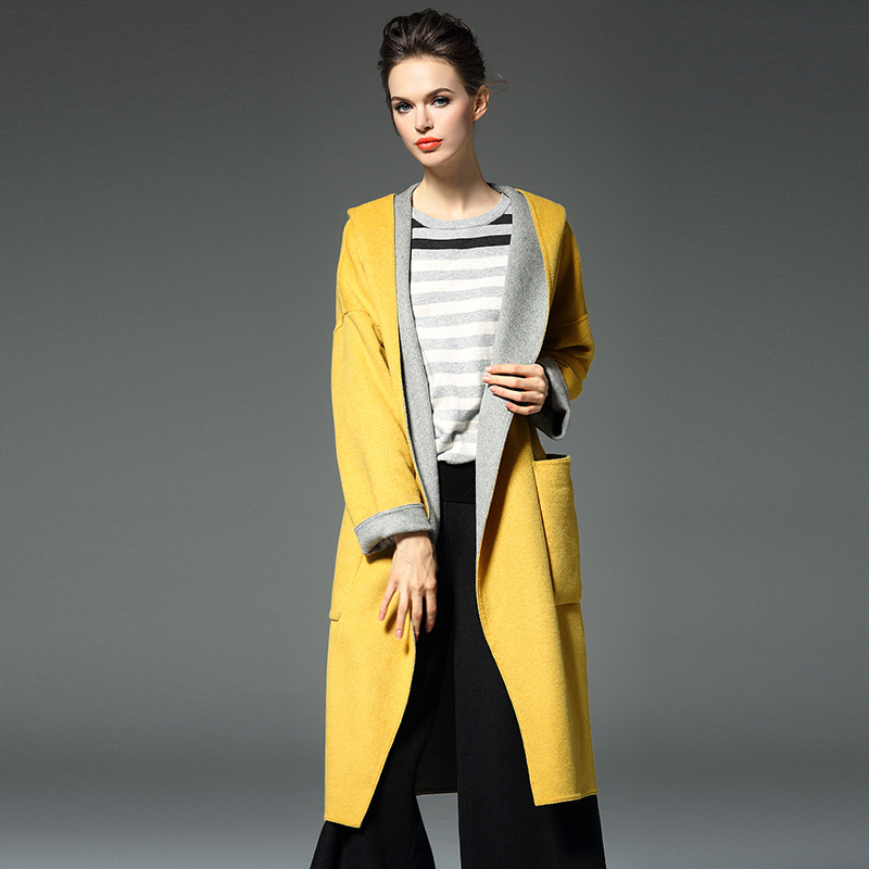 歐美秋冬新款女裝 連帽兩穿毛呢外套女風衣 雙面呢長款大衣 /