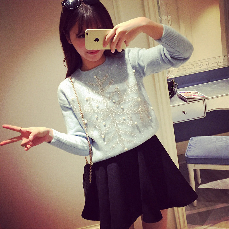廠家直銷秋冬新款歐美雪花亮片釘珠針織羊毛衫圓領(lǐng)長袖圣誕毛衣女 /