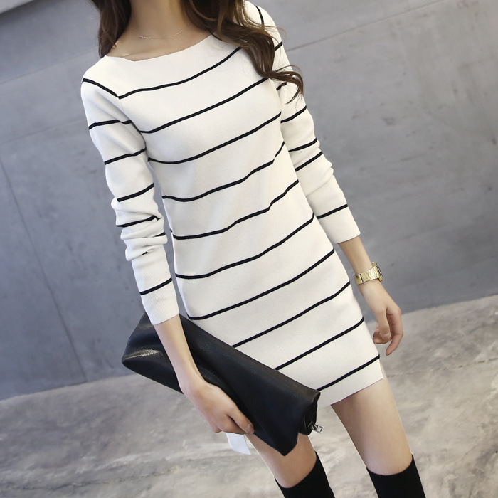 2015秋冬韓版新款一字領(lǐng)條紋修身中長款套頭長袖毛衣女連衣裙打底 /