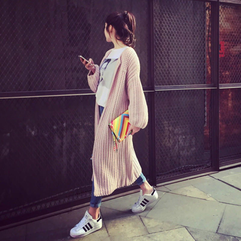 2015秋季韓版新款中長款開衫粗棒針織衫毛衣純色燈籠袖寬松厚外套 /