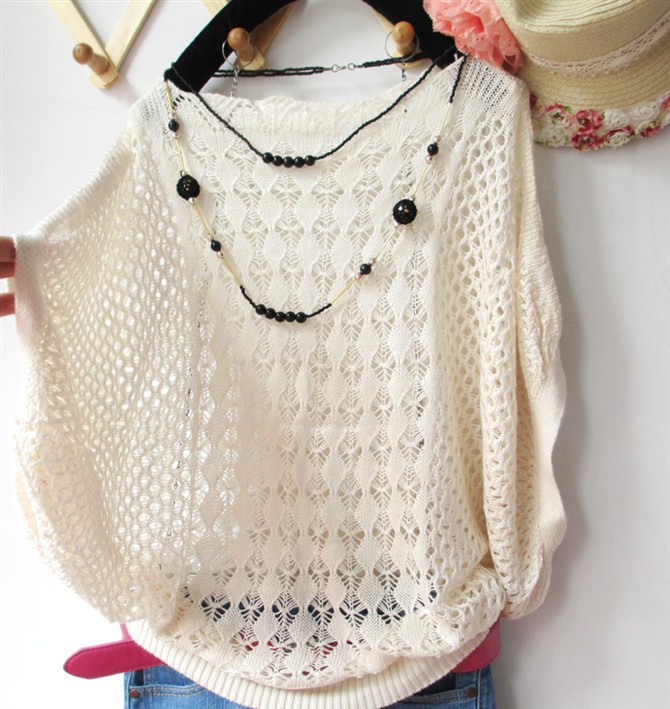 清倉價 大碼毛衣寬松一字領鏤空蝙蝠衫針織衫短袖泡袖罩衫 /