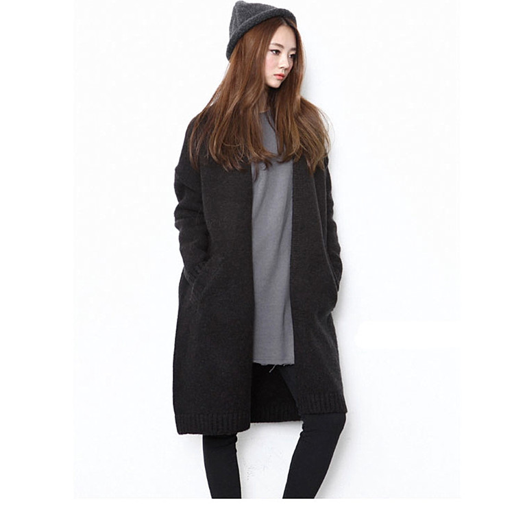 2015秋冬韓版新款純色針織衫大碼長款口袋毛衣無扣開衫外套女 /
