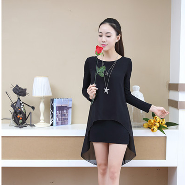 2015秋裝韓版中長款T恤女大碼上衣修身假兩件雪紡長袖連衣裙 /