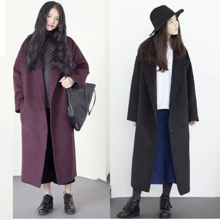 秋冬oversize復古寬松長款酒紅色羊毛呢外套繭型呢子大衣現貨 /