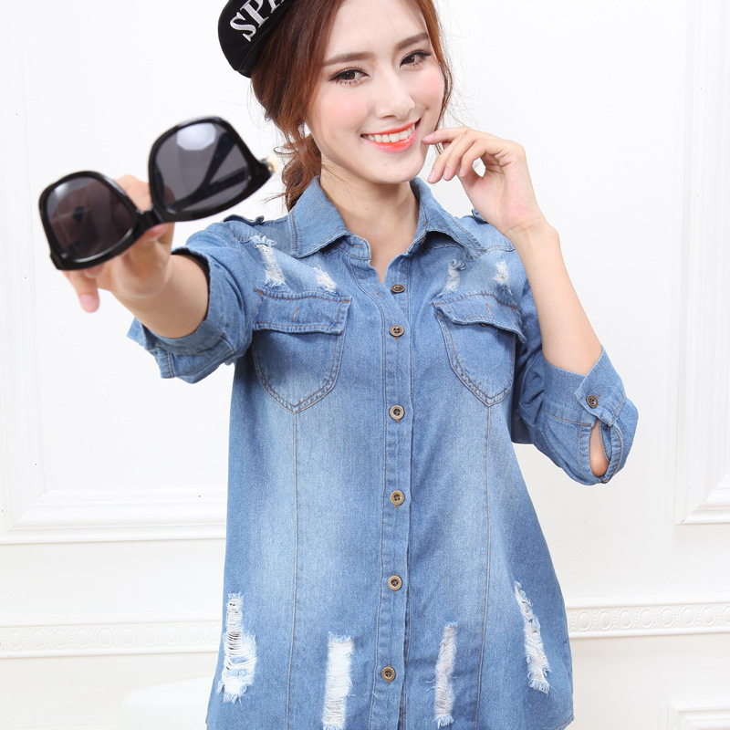 2015秋裝新款女裝翻領長袖牛仔外套胖MM修身大碼磨破洞開衫上衣 /