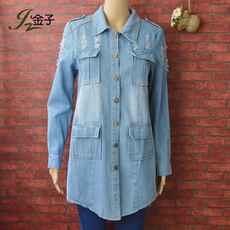 2014新品 磨破做舊淺牛仔外套 中長款大口袋翻領長袖牛仔上衣 女 /