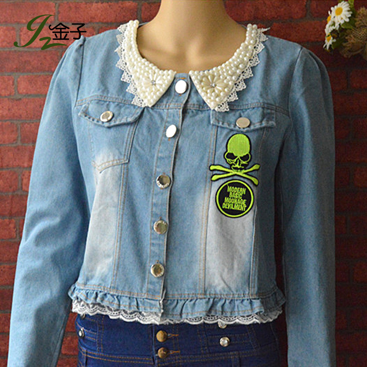 2015春夏新款 韓版修身顯瘦時尚釘珠牛仔外套 骷髏印花牛仔上衣 /