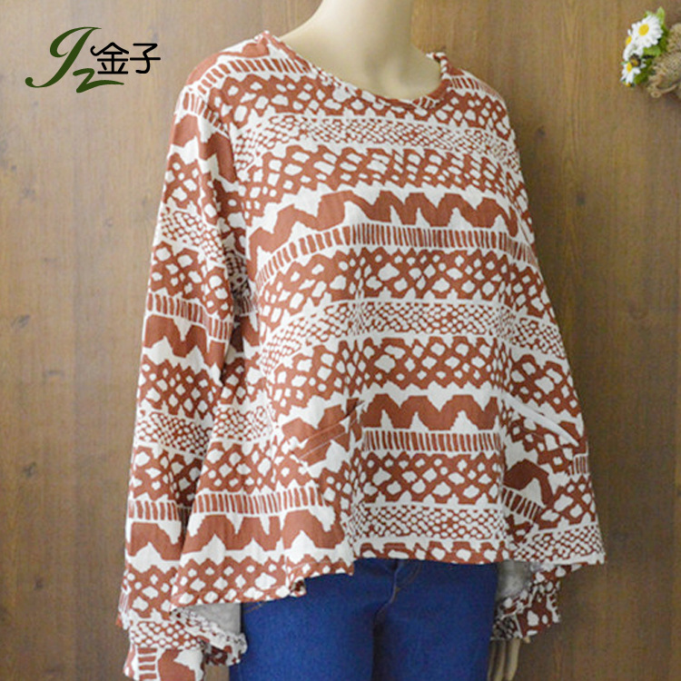 2015森女系棉麻女裝 新款圓領長袖印花女士T恤 寬松套頭打底上衣 /