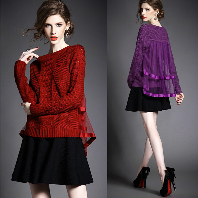 2015秋冬季新款針織衫 歐美高端氣質純色網紗拼接加厚長袖毛衣 /
