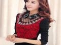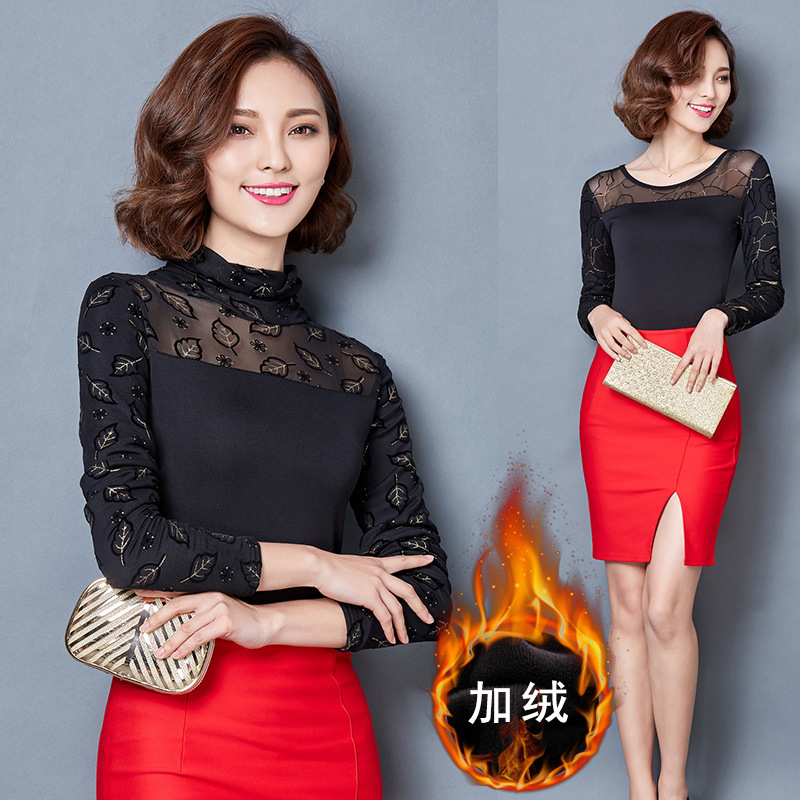 2015冬季新款修身女加絨加厚鉆石絨長袖蕾絲打底衫韓版大碼上衣 /