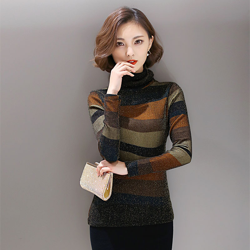 秋冬大碼加絨加厚T恤新款燙金樹葉高領網紗長袖修身保暖打底衫女 /
