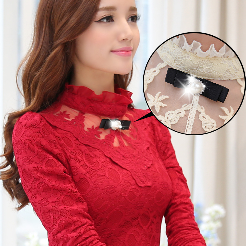 蕾絲衫女2015秋冬韓版加絨加厚娃娃領泡泡袖打底衫修身套頭蕾絲衫 /