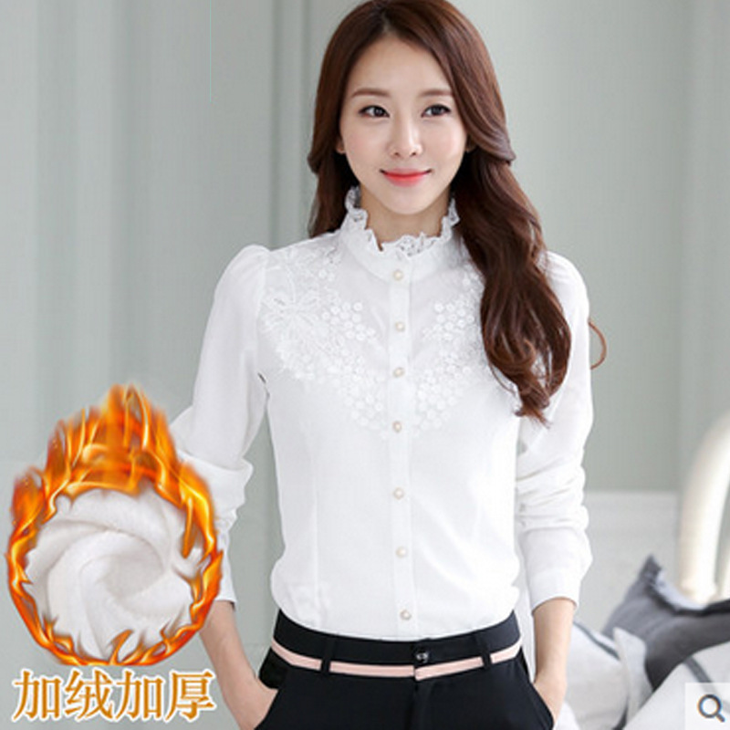 加絨襯衫女韓范 秋冬蕾絲打底衫女裝衣服雪紡修身立領(lǐng)襯衫女長(zhǎng)袖 /