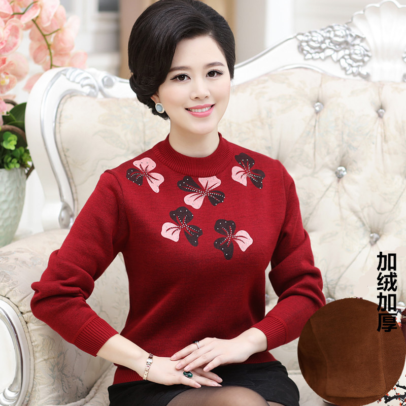 中老年媽媽裝冬裝新款加絨套衫長袖高領加厚毛衣女裝針織衫秋 /