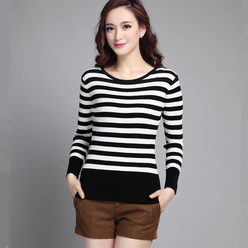 2014女裝新款長袖秋冬打底衫圓領條紋毛衣韓版修身撞色針織打底衫 /
