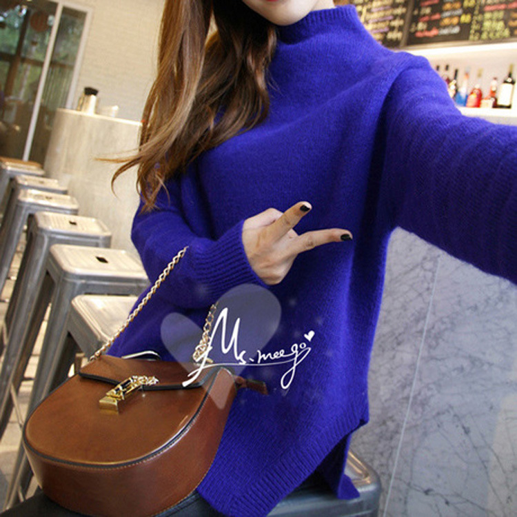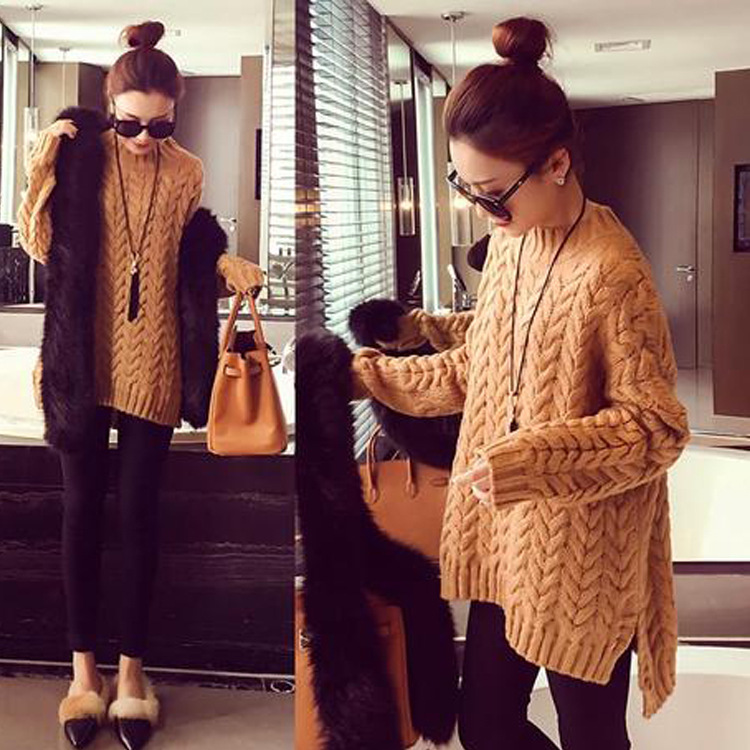 2015韓版加厚慵懶寬松半高領(lǐng)中長款下擺側(cè)開叉針織衫女套頭毛衣 /