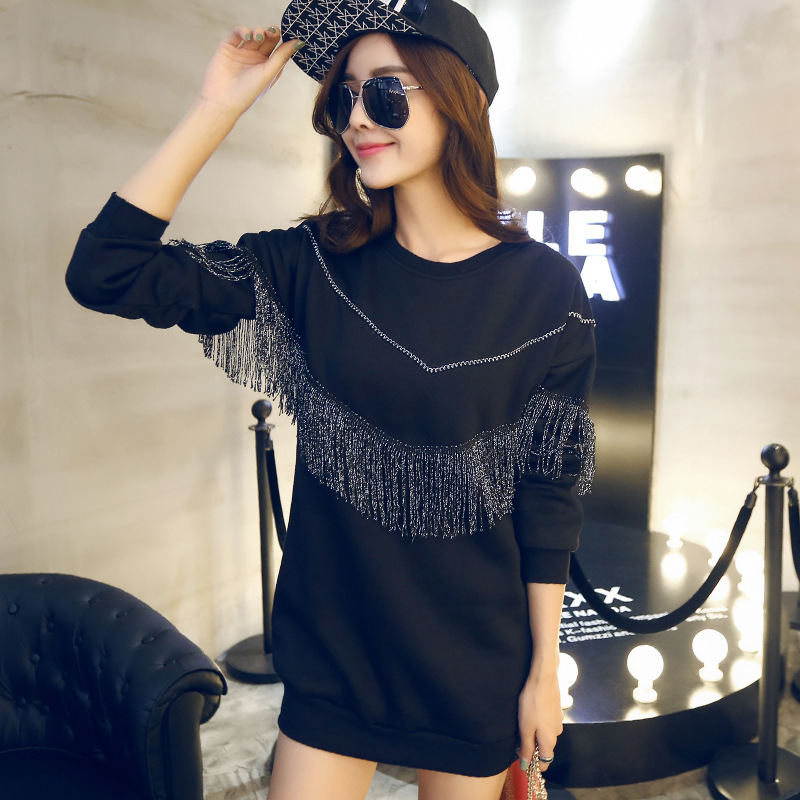 2015新款寬松中長款流蘇加絨加厚長袖衛衣連衣裙女套頭秋冬上衣潮 /