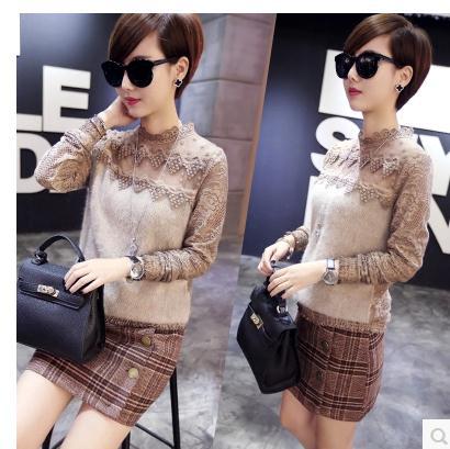 2015冬季新款歐洲站兔毛拼接修身打底衫女潮長袖立領蕾絲衫 /