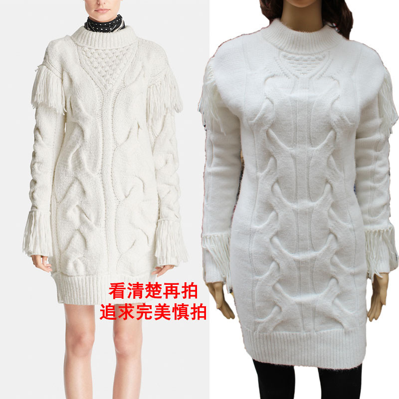 2015紐約時裝周明星唐嫣同款長袖流蘇圓領套頭格紋針織連衣裙批發 /