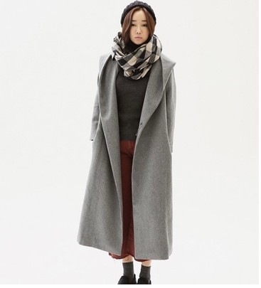 2015冬新款歐美BF風超長款Oversize大碼連帽加厚羊毛呢大衣 /