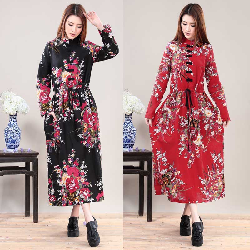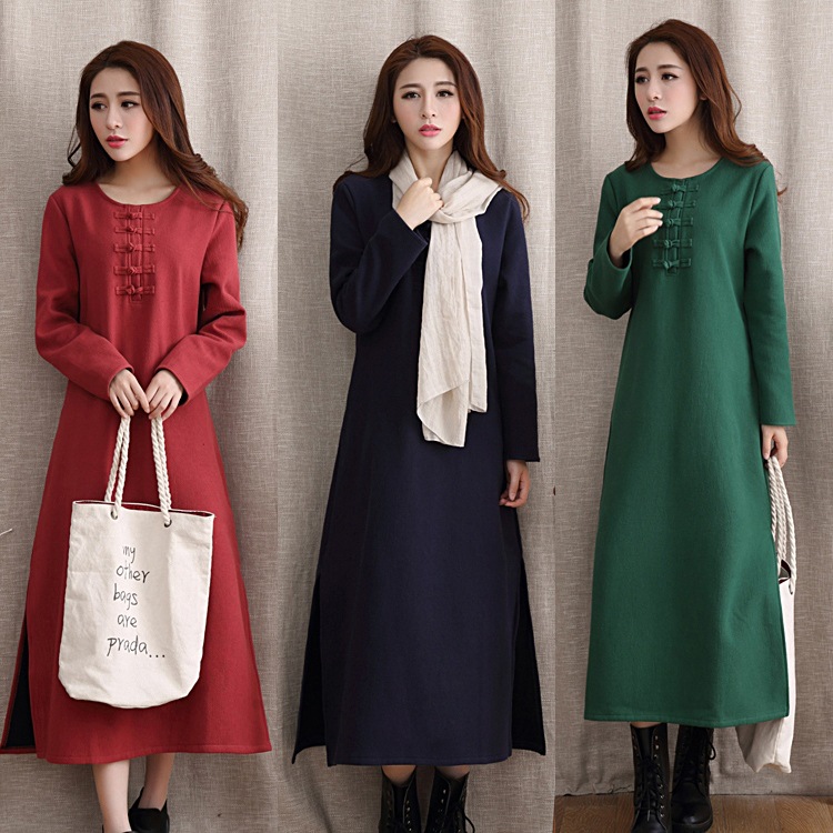 2015復古文藝秋冬中國風棉麻加絨盤扣連衣裙寬松長袖氣質超長裙子 /