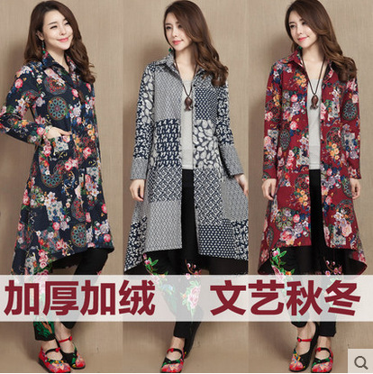 2015秋冬季民族風加絨加厚女裝時尚棉麻印花襯衫中長款外套 /