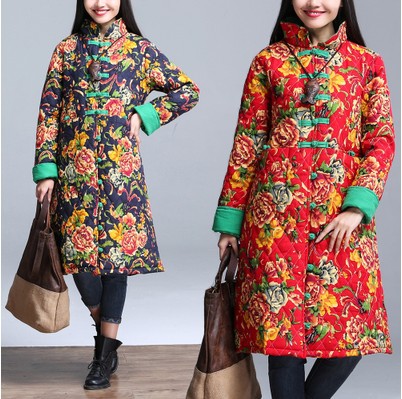 2015民族風女裝長款盤扣棉衣女棉麻印花中式復古秋冬裝棉襖 /